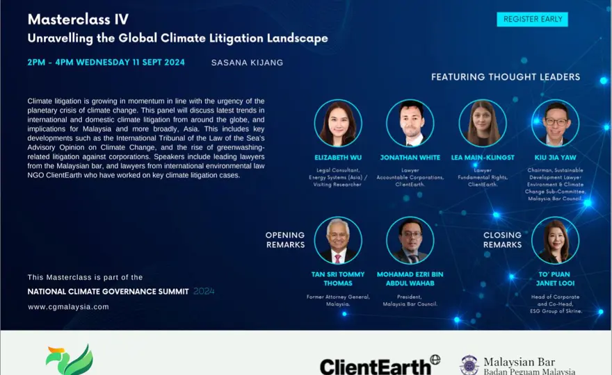 ClientEarth’s very own Elizabeth Wu, Lea Main-Klingst and Jonathan White will be at a masterclass as part of National Climate Governance Summit, organised by Climate Governance Malaysia in collaboration with the Malaysia Bar Council on 11 September 2024.